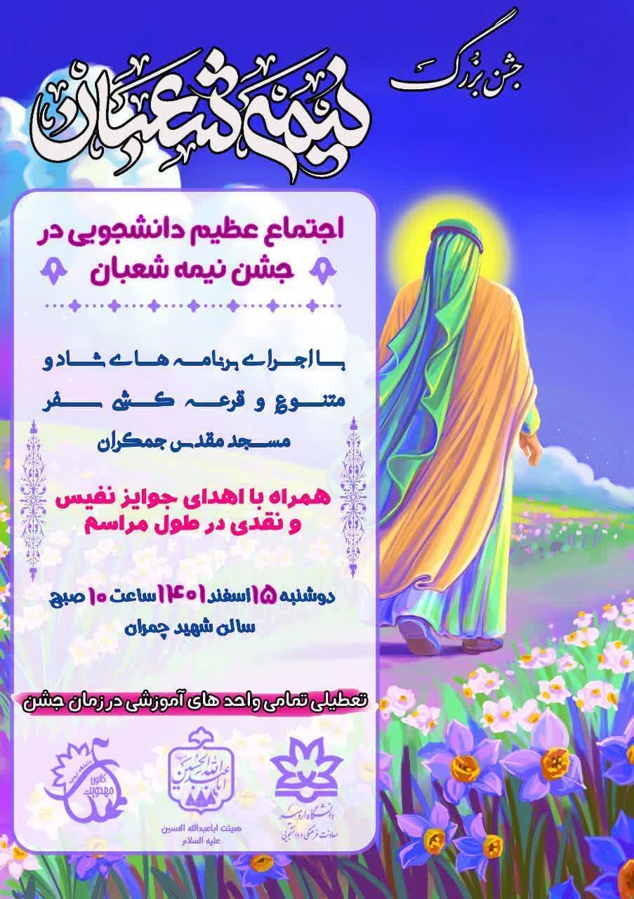 کانون مهدویت و هیات اباعبدالله (ع) با حمایت معاونت فرهنگی و دانشجویی دانشگاه ارومیه، بهمناسبت سالروز ولادت با سعادت امام زمان (عج) و نیمه شعبان، اقدام به برگزاری جشن این روز فرخنده نموده است.